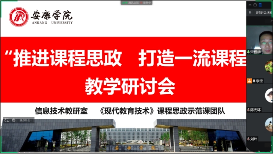 会议伊始,李宝介绍《教育部关于一流本科课程建设的实施意见》、《金年会jinnianhuicom一流课程建设实施意见》等文件内容。随后,《现代教育技术》课程思政示范课负责人宋权华对课程目前建设情况作了简要介绍,并对课程下一步建设的计划和具体工作进行安排部署。同时,结合参加陕西省思政课教师“大练兵”省级展示活动,在《现代教育技术》课程中如何挖掘思政元素、融入思政元素等与参会老师进行分享交流。