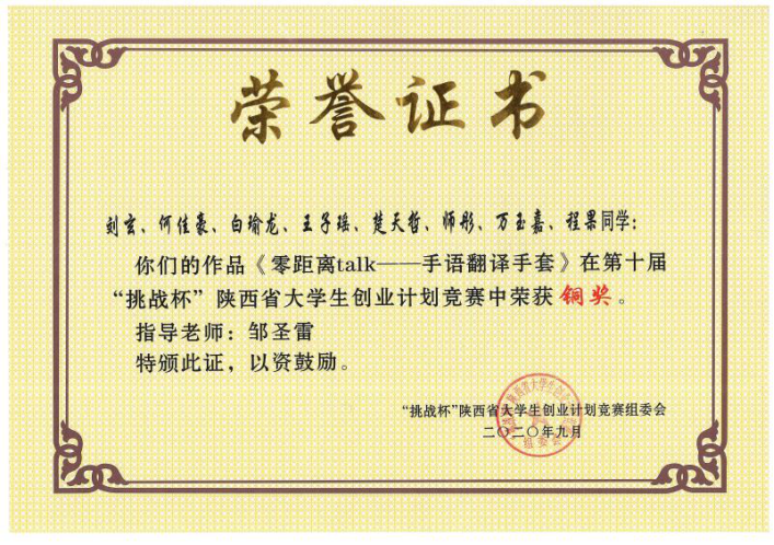 9月11日,由共青团陕西省委、陕西省委教育工委、陕西省科协、陕西省社会科学院、陕西省学联共同主办,西安翻译学院承办的第十届京东未来“挑战杯”陕西省大学生创业计划竞赛落下帷幕。我院 崔智军、刘星亮、邹圣雷老师指导学生完成的三个项目 《小型移动在线水质监测系统》《爱(AI)看“茶”》《手语翻译手套》 获得三等奖 3 项