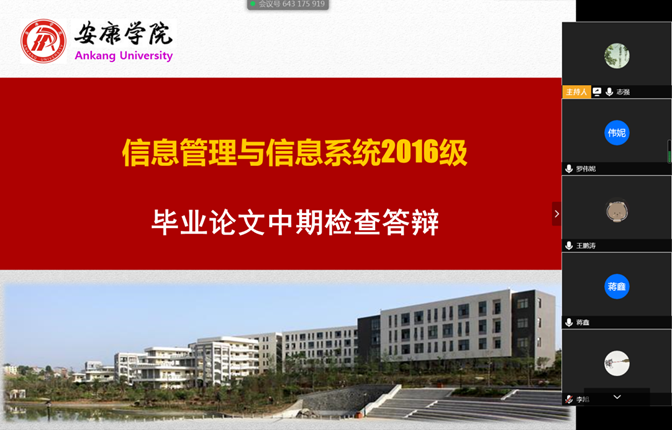 由于受新冠肺炎疫情影响,依据金年会诚信信誉至上2020届毕业论文(设计)的总体工作安排,按照信息管理系毕业论文工作进度要求,确保2020届信息管理与信息系统专业毕业生的毕业论文(设计)工作不因疫情而受严重影响,督促检查学生毕业论文(设计)进展情况,信息管理系各答辩小组精心组织安排、提前测试腾讯会议线上答辩平台,于4月12日前圆满完成信息管理与信息系统专业2020届毕业论文(设计)中期检查工作。