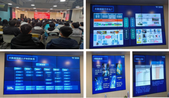 参观体验结束后,美林数据技术股份有限公司高级项目经理柴理想给同学们作了“大数据时代与人才需求”的主题报告,面对面和学生展开交流。柴经理介绍了宏观的大数据技术在国内数字经济产业的应用现状、国内企业对于数字人才的旺盛需求和具体岗位能力要求,现场分享了美林数据的具体项目——基础设施投融资建设运营平台、科技园区发展建设运营平台、功能性投资平台等项目成果以及项目资源架构,使学生们对于未来的职业发展更加清晰。