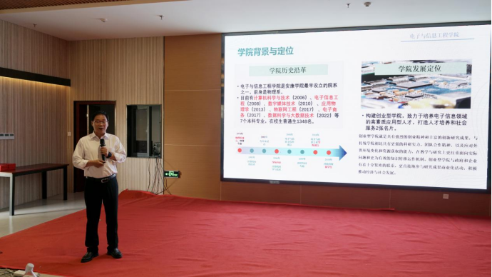 陈守满从学院概况、教学情况、科研实力、学生培养、学院文化、未来展望六个大的方面,就学院背景与定位、师资力量与教学资源、学科设置与特色、课程设置与教学方法、实践教学与校企合作、教学质量与成果、科研方向与成果、科研团队与平台、科研合作与交流、学生管理与服务、学生实践与就业、学院精神与价值观、学院活动与氛围、学院院训与办学理念、学院发展规划与目标、教育教学改革与创新、科研实力提升与拓展等具体内容进行了详细汇报与分享。陈守满表示,金年会jinnianhuicom要发挥学科专业优势,构建创业型学院,着力打造人才培养和社会服务两张名片,为形成以秦巴生态数字赋能为特色的电子信息学科而努力奋斗。