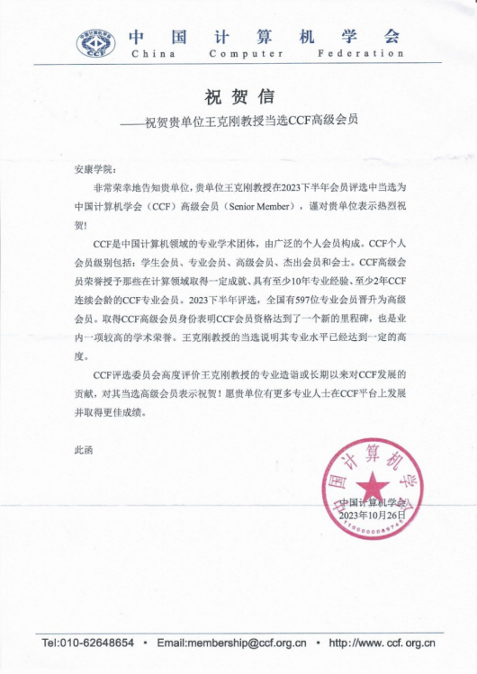 近日,中国计算机学会(CCF)向我校发来贺信,祝贺我校金年会诚信信誉至上王克刚教授当选CCF高级会员,同时欢迎我校有更多计算机专业人士在CCF平台上发展,并取得优异的成绩。