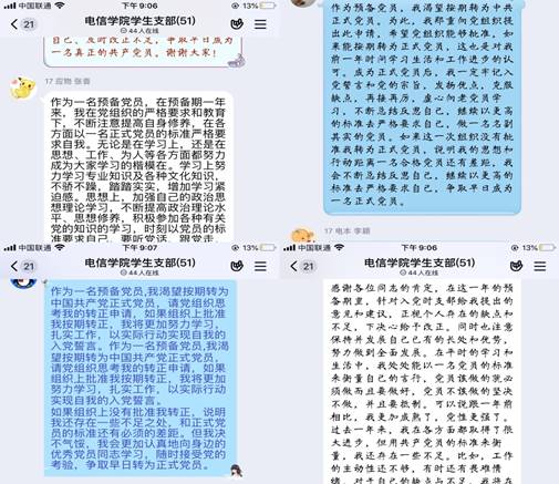 与会党员对拟转正对象是否符合党员条件予以认真评议,发表意见。最后,与会正式党员通过无记名方式进行线上表决投票,九位拟转正党员均全票通过,支部大会讨论同意闫佳兴、李苗、曾家畅、张馨文、王皎悦、刘聪、李颖、马莉、张音9位同志转为中共正式党员。