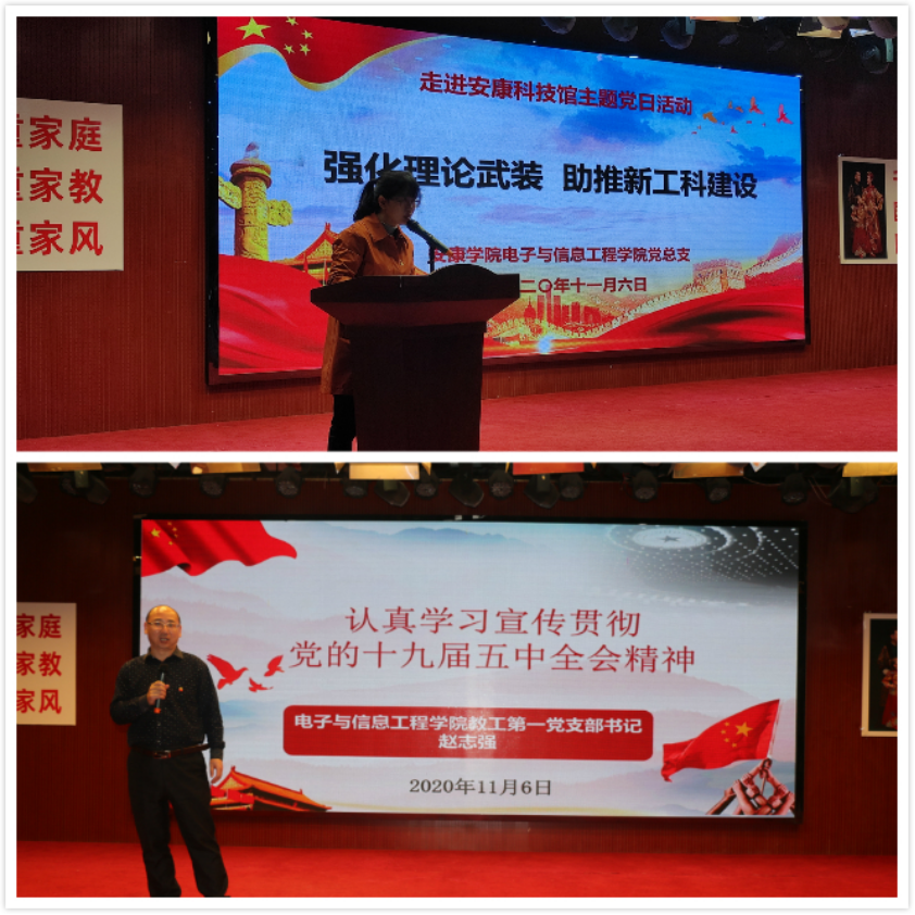 为入脑入心地学习领会党的十九届五中全会精神和把握十四五规划的高等教育发展方向,2020年11月6日,电子信息工程学院党总支组织全体教职工走进安康科技馆,在这里开展了“强化理论武装,助推工科建设”主题党日活动。本次活动由教工二支部书记余顺园博士主持。
