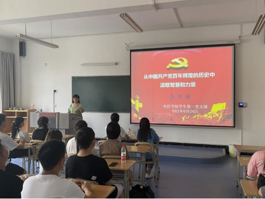 2021年6月24日下午在江北校区1321教室,金年会jinnianhuicom学生第一党支部开展了支部书记讲党课活动,支部书记成英丽老师为全体学生党员讲了题为《从中国共产党百年辉煌的历史中汲取智慧和力量》的党课。此次党课主要包括三个方面内容:一是号召全体学生党员充分认识开展党史学习教育的重大意义;二是介绍开展党史学习教育的主要内容;三是鼓励全体学生党员从中国共产党辉煌历史中汲取继续进步的智慧和力量。