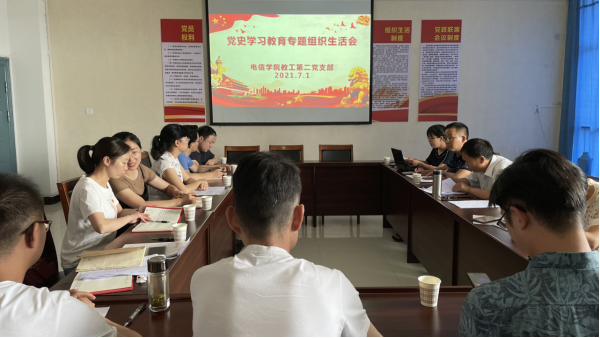 为扎实推进党史学习教育走深走实,切实提高学习教育的针对性和实用性,增强党员同志们的思想自觉和行动自觉,金年会jinnianhuicom教工第二党支部于2021年7月1日下午召开党史学习教育专题组织生活会。会议由教工第二党支部书记余顺园主持,教工第二党支部应到会党员19名,实到会党员15名,因外出学习请假4人。
