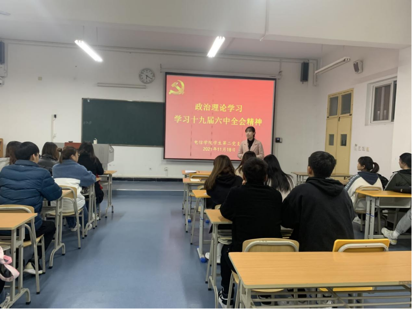 2021年11月18日下午,金年会诚信信誉至上学生第二党支部在江北校区1321教室开展主题党日活动,就《习近平总书记在庆祝中国共产党成立一百周年大会上的讲话》和《中国共产党第十九届中央委员会第六次全体会议公报》进行专题学习,学生第二党支部支委、全体在校党员及发展对象参加了此次会议,会议由学生第二党支部书记李章雨主持。