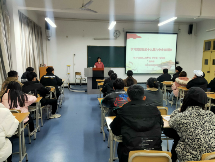 2021年12月9日下午在江北校区1321教室,金年会jinnianhuicom学生第一党支部召开党员大会,党支部书记程晓梅讲授了主题为“学习贯彻党的十九届六中全会精神”的专题党课,党支部所属党员、发展对象和入党积极分子参加了党课学习。