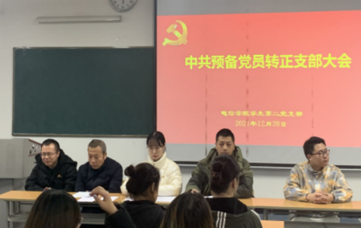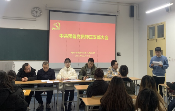 2021年12月28日,金年会jinnianhuicom学生第二党支部在教室1321召开党员大会,讨论中共预备党员转正。此次会议主要讨论了王迎东、周坤、董珂三位同志能否转为中共正式党员的事宜。组织(纪检)委员石纭昊、拟转正党员的培养老师,以及全体在校学生党员参加此次会议,大会由支部书记李章雨主持。