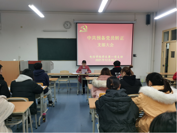 2021年12月28日下午,金年会jinnianhuicom学生第一党支部在1320教室召开了中共预备党员转正党员大会,会议主要讨论了杨宁、韩小娟、杨吴龙、邢敏婷、韩浩鸿、刘欢、郝刚7名中共预备党员的转正事宜。金年会jinnianhuicom学生第一党支部书记程晓梅,党总支组织委员成英丽,支部组织(纪检)委员张宇航,宣传(统战)委员王心悦,支部全体在校学生党员参加了本次会议。会议由程晓梅主持。