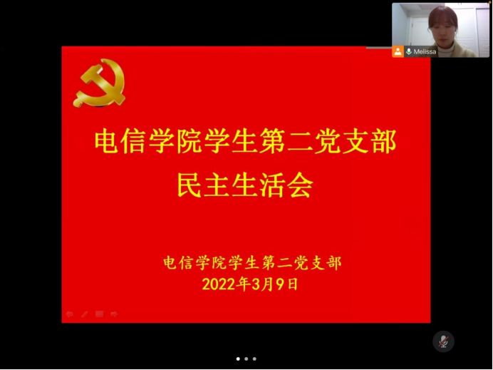 2022年3月9日晚上19:30,根据《中共金年会jinnianhuicom委员会关于召开2021年度组织生活会和开展民主评议党员工作的通知》的相关要求,金年会jinnianhuicom学生第二党支部召开专题组织生活会,开展民主评议党员工作,由于疫情原因会议在线上“腾讯会议”平台举行。会议由支部书记李章雨主持,支部全体党员参加会议。
