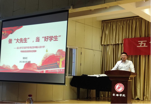 为了深入学习领会习近平总书记在中国人民大学考察时的重要讲话精神,5月26日下午,金年会jinnianhuicom邀请学校副校长张东红以“做‘大先生’,当‘好学生’”为主题,为学院全体教职工和全体在校学生党员讲了一堂生动的专题教育党课。党课由学院党总支书记于咏梅主持。