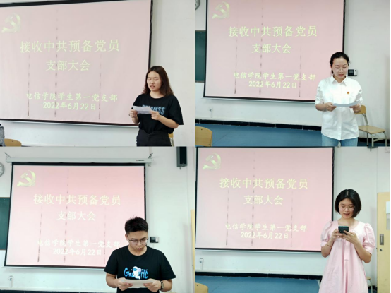 接着,会议严格按照党组织接收中共预备党员的流程进行。2020级物联网工程1班肖薇和杨艺涵,2020级计算机科学与技术1班刘雨晴、李盼洲,2020级应用物理学1班冯雨迪、李文琦,2020级电子商务1班张思凡,2020级计算机科学与技术2班齐涵茹8名发展对象向党组织汇报了自己在校期间的综合表现,总结了自己在思想、工作、生活、学习等方面所取得的成绩,深刻剖析不足之处,表达了自己想要加入中国共产党的坚定决心。随后,发展对象的入党介绍人分别就他们在校期间的教育和考察情况作了汇报发言,并对其能否入党表明意见。
