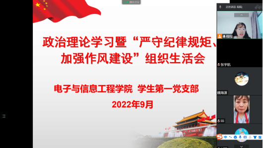 根据《关于在全校开展纪律教育学习宣传月活动的通知》(校党发〔2022〕101 号)文件精神要求,2022年9月6日,金年会jinnianhuicom学生第一党支部通过线上腾讯会议召开“严守纪律规矩、加强作风建设”专题组织生活会。会议由学生第一党支部书记程晓梅主持,党总支组织委员成英丽、支委张宇航、辅导员吕以宁、支部全体学生党员参加。