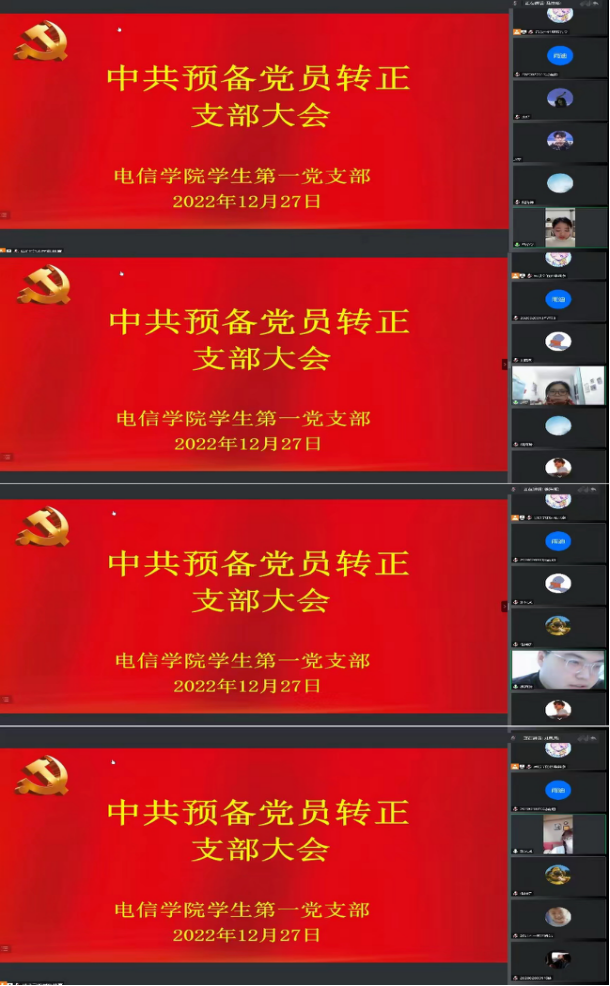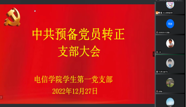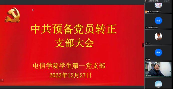 12月27日晚上八点,金年会jinnianhuicom学生第一党支部采用线上腾讯会议的形式召开了中共预备党员转正党员大会,会议主要讨论了赵梦等8名中共预备党员的转正事宜。金年会jinnianhuicom学生第一党支部书记吕以宁,党总支组织委员成英丽,支部组织(纪检)委员张宇航,入党培养老师王克刚、成典勤老师以及支部全体党员参加了本次会议。会议由吕以宁主持。