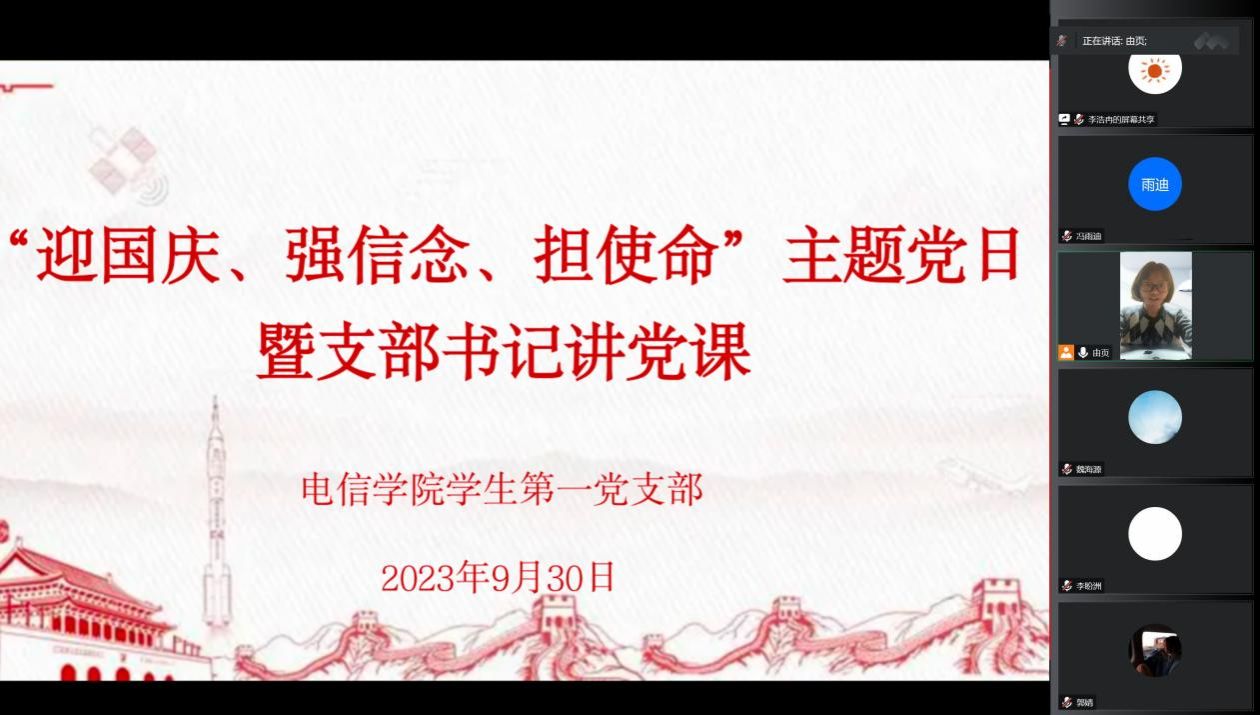 为庆祝中华人民共和国成立74周年,激励支部党员听党话、感恩党,跟党走,增强支部成员的凝聚力、战斗力和号召力,2023年9月30日下午19:30,金年会jinnianhuicom学生第一党支部通过线上腾讯会议,开展“迎国庆、强信念、担使命”主题党日暨支部书记讲党课。本次活动由学生第一党支部书记吕以宁主持,学生第一党支部全体党员参加。
