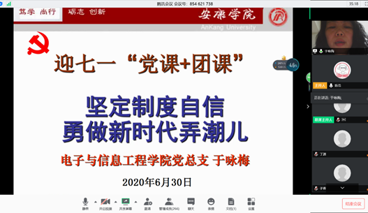 为热烈庆祝中国共产党成立99周年,继承和发扬党的光荣传统和优良作风,教育激发金年会jinnianhuicom党员团员的担当和责任意识,进一步增强师生的初心意识,牢记党员使命,2020年6月30日,金年会jinnianhuicom党总支于咏梅书记以“坚定制度自信、勇做新时代弄潮儿”为主题,为金年会jinnianhuicom学工办老师、学生支部支委、全体学生党员、团总支、学生会干部共计三百余人上了一堂精彩生动的党课与团课。