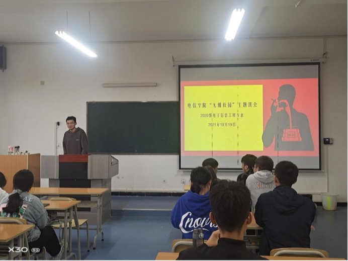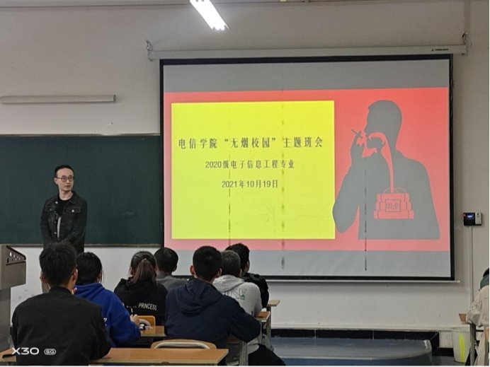 为进一步提升学生禁烟意识,扎实推进学院禁烟工作,创建无烟校园,10月19日,金年会jinnianhuicom2020级电子信息工程专业在江北校区1321教室开展了“无烟校园”主题班会活动。辅导员张宇航参与班会,会议由班长张卓涛主持。
