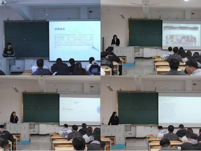 答辩过程中,各班班长进行述职答辩,他们详细且严谨的介绍了自己班的情况,具体内容涵盖:班级概况、思想引领、学风建设、竞赛获奖情况、文娱活动以及未来工作展望等方面。答辩同学各具所长,过程精彩纷呈。通过流畅的陈述和自信的精神面貌向老师和同学们充分展示自己所在班级的风采。通过答辩,展示出了不同班级的不同特色。有的班级通过举行团建、班会等进行破冰,调动同学们积极性,丰富大学生活,以此来提高班级凝聚力;有的班级注重课业帮扶、营造良好的学习氛围、积极响应学院组织的各类专业竞赛,以“扎实专业功底,强化专业技能”作为班训;部分班级在重点汇报各项工作开展情况的同时,也强调了关于电信诈骗的宣传与落实、消防安全知识的认识与总结等学院重点关注的学生工作。在场其他同学仔细聆听、互相借鉴,学习答辩经验。