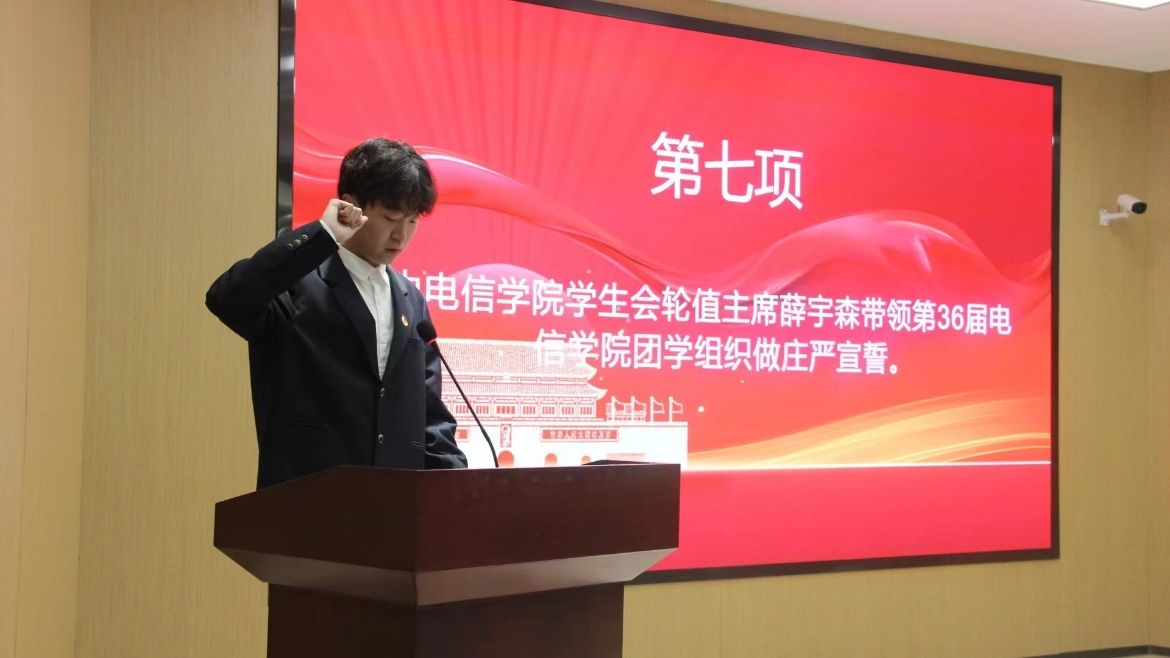 接着,张宇航及团学组织负责人分别为学生干部颁发了聘书。同时,在学生分会轮值主席薛宇森的带领下,第36届学生组织全体干部庄严宣誓,坚定了全心全意为同学服务,为金年会jinnianhuicom更好的明天而努力奋斗的决心。