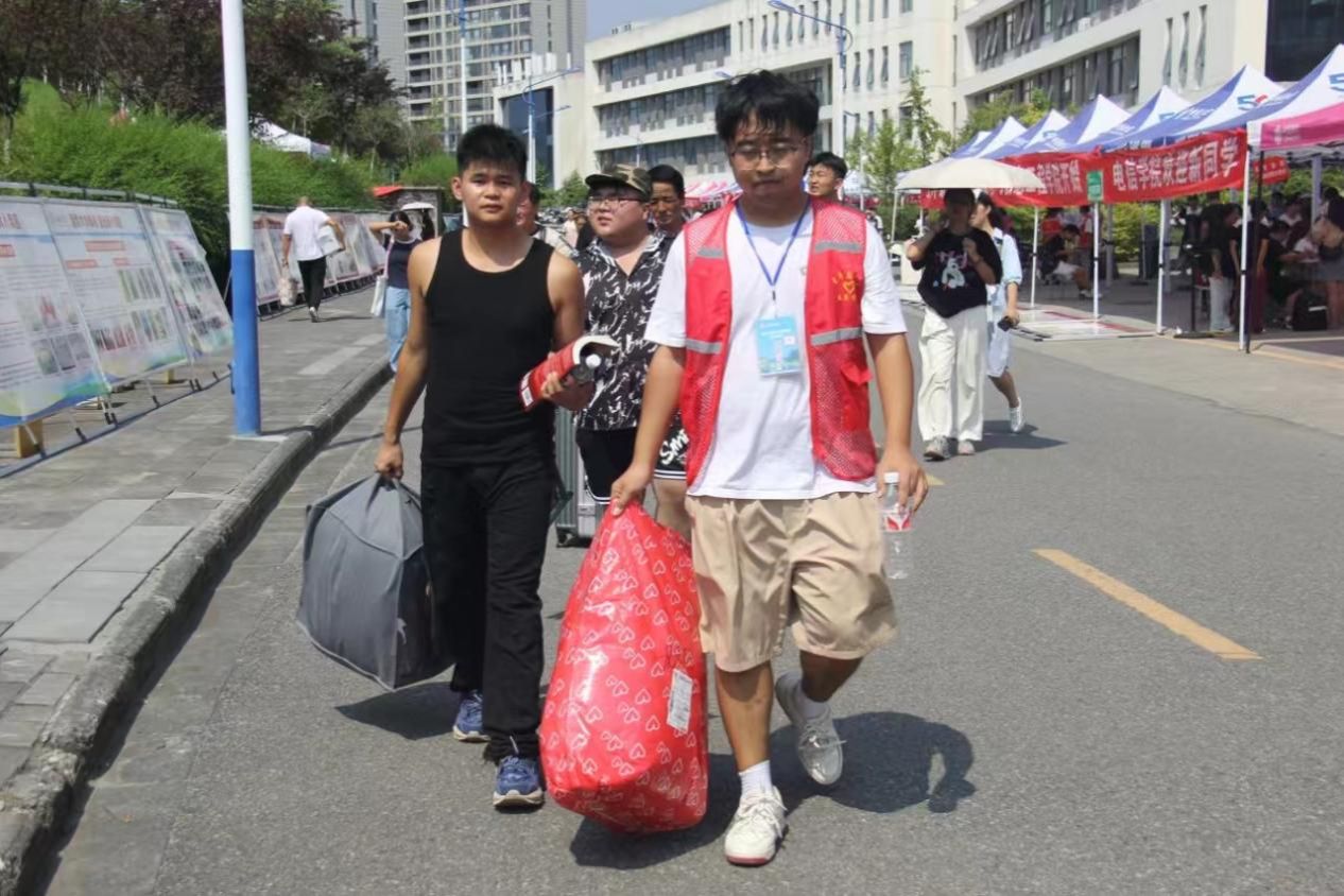 通力合作、有条不紊。醒目的横幅高悬、欢迎的标语绚丽,学院师生在为期两天半的迎新工作中,每个人脸上洋溢着幸福的笑容。团总支、学生会、社团服务中心及志愿者服务队的学生们,身着志愿者马甲,帮助新生们完成签到注册、领取校园卡等报到手续。随后,他们帮助同学和家长运送行李到宿舍,引导同学们前往宿管处办理入住手续并领取宿舍钥匙。他们坚守在迎新工作一线,不畏炎阳,不惧劳累,以高度的责任心和积极的工作态度,细致入微地完成了各项服务工作。