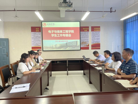 9月29日,电子与信息工程学院在江北校区科技楼B702召开学生工作专题会,集中研讨各年级学生在生活、学习、思想、行为等方面存在的问题以及学生管理工作中存在的不足。院长陈守满,党总支书记于咏梅、副院长王克刚、副书记蔡正旺、副院长宋权华、学生工作办公室主任石纭昊及全体辅导员参加本次会议。