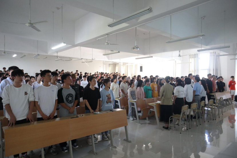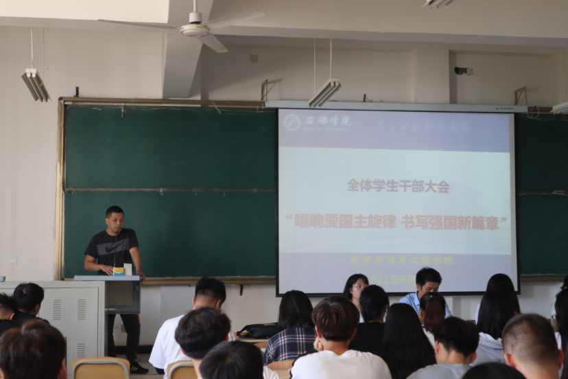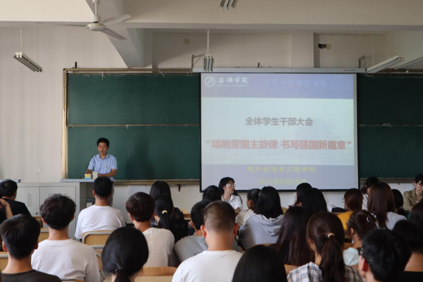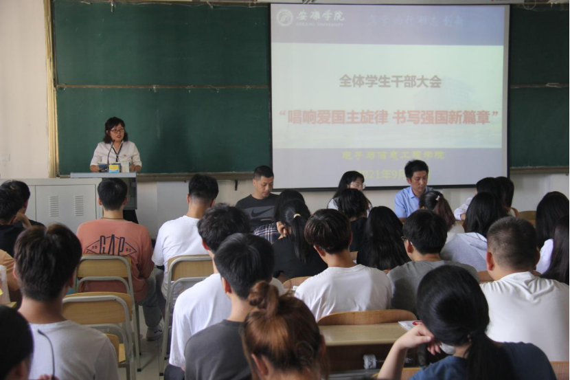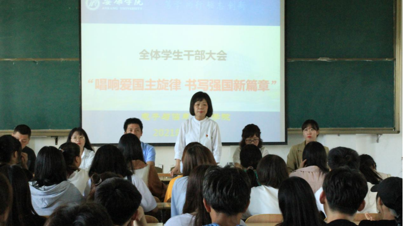 为庆祝中华人民共和国成立72周年,引导广大青年学生自觉践行社会主义核心价值观,涵养家国情怀,增强感恩意识,以实际行动向国庆献礼。9月29日下午2:30,在江北校区1301教室金年会jinnianhuicom党总支书记于咏梅以“唱响爱国主义旋律,书写强国新篇章”为主题为广大电信学子讲党课、团课。金年会jinnianhuicom在校学生党员、本届团总支、学生会主要干部及2019、2020、2021级主要干部、宿舍长200余人参加大会。党总支书记于咏梅,党总支副书记蔡正旺,学工办主任石纭昊,党总支组织委员成英丽,学生第一党支部书记程晓梅,学生第二党支部书记李章雨出席大会。大会由石纭昊主持。