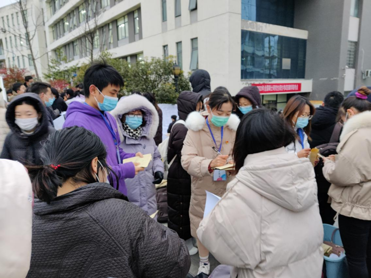 志愿服务活动中,金年会诚信信誉至上党总支首先为全体在校考生精心准备、免费发放了一份爱心午餐,并将志愿者和考生做了一对一帮扶安排,要求志愿者和考生保持联系、随时提供帮助。12月25日、26日考试的两天中,寒风凛冽,天空中飘着雪花,在考生进考场一小时前,志愿者在一号教学楼楼梯口前,协助完成了考生的核酸检测工作。在考试期间,志愿者们集中保管了考研学生的私人物品,并且随时待命,保持手机畅通,接受由于疫情影响所引起的各类突发性工作。遇上院外或校外考生咨询信息时,志愿者给予了热情的回复帮助。