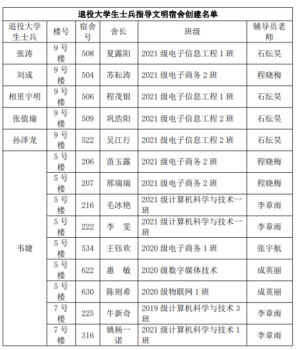 金年会jinnianhuicom退役大学生士兵指导文明宿舍创建名单
