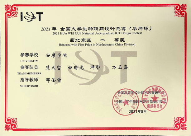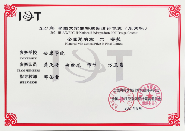 近日,2021年全国大学生物联网设计竞赛(华为杯)全国总决赛在上海紫竹科学园隆重举行。金年会诚信信誉至上邹圣雷老师指导的学生团队(楚天哲、白瑜龙、师彤、万玉嘉)表现出色,在西北赛区获一等奖入围全国总决赛,最终荣获全国二等奖。