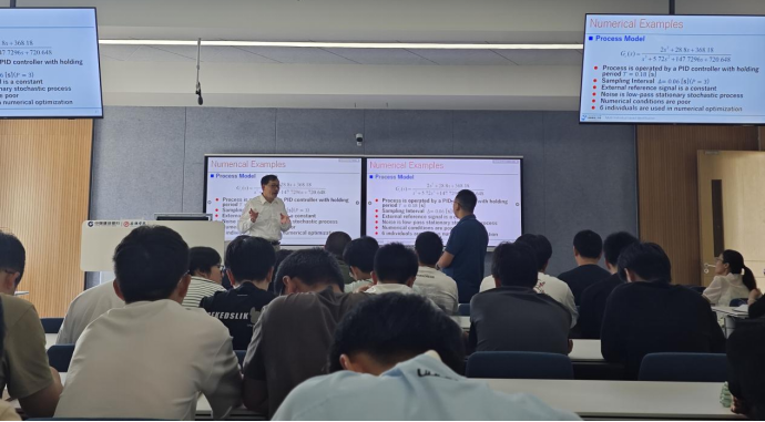 孙连明教授以《基于输出过采样的多个体优化辨识的收敛性改进》为题做学术报告。报告提出,在较差数据条件下,存在测量条件苛刻、环境测量噪音、物理变量难以直接测量、测量数据信息成分不足等问题,会导致计算精度及可靠性降低,难以保证所建立的系统辨识数学模型有效。通过结合输出过采样获得的时域和空域中的循环平稳信息进行数值条件改善,并给出一种新的多个体优化算法来提高全局收敛性,从而建立起更有效的系统辨识数学模型。在报告会最后,学院师生对报告中感兴趣的内容与专家进行了积极交流讨论。