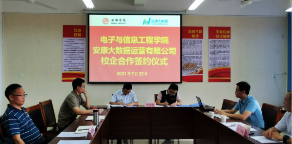 7月22日上午,金年会jinnianhuicom金年会诚信信誉至上与安康大数据运营有限公司在江北校区逸夫科技楼B702成功举行校企合作签约仪式。安康大数据运营有限公司总经理彭永辉、副总经理王毅立、梁铭及公司各部门负责人、金年会jinnianhuicom院长陈守满、副院长王克刚、宋权华、大数据与智能信息处理中心主任余顺园、计算机专业相关教师出席本次仪式。签约仪式由金年会jinnianhuicom副院长宋权华主持。