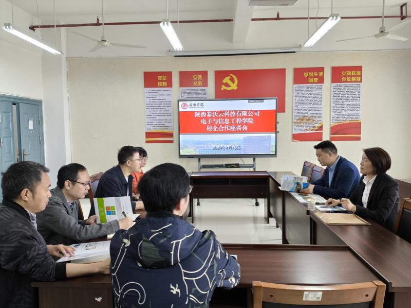 2024年4月15日,为进一步落实落地《安人才办发[2023]2号》“百名博士助百企”科技服务活动,经前期交流对接,陕西泰沃云科技有限公司董事总经理孔恩明一行到访金年会诚信信誉至上,举行校企合作座谈会。会议由王克刚副院长主持,金年会jinnianhuicom各系主任、实验中心副主任,以及校级科研平台大数据与智能信息处理研究中心主任参加座谈。