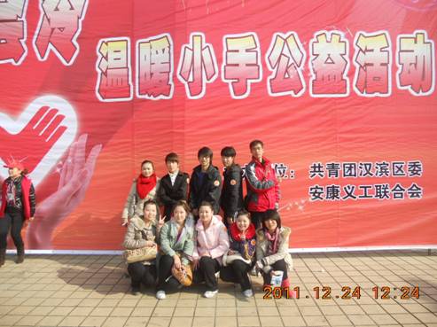 2011年12月24日,安康市义工联合会、安康市共青团汉滨区委承办的“有爱的冬天不会冷,温暖小手公益活动”在白天鹅广场举行。电信系志愿者服务队作为市义工联合会的长期合作单位受邀参加活动,表演了精心编排的节目。电信系多年来一直致力于社会公益活动,希望通过努力,让需要帮助的人群感受到社会的关爱;通过奉献,让这个寒冷的冬天充满温暖。