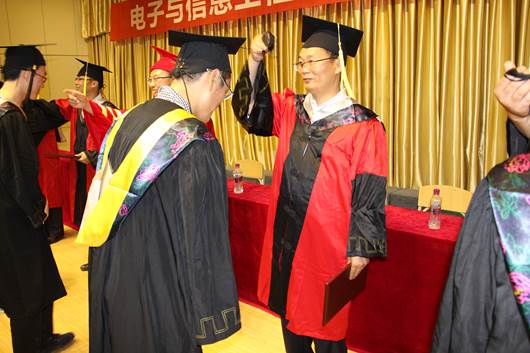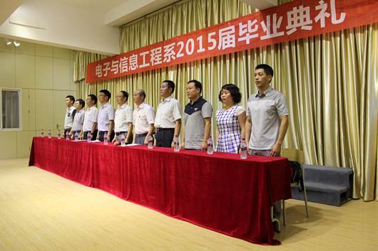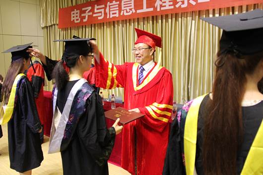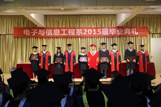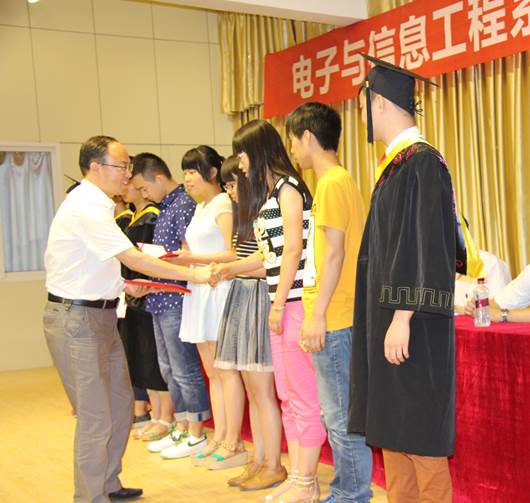 在悠扬的毕业歌中,副校长杨行玉教授、电信系主任张东红教授、电信系陈守满教授、王庆春副教授、付争方副教授为毕业生一一授予了学士学位证书。
