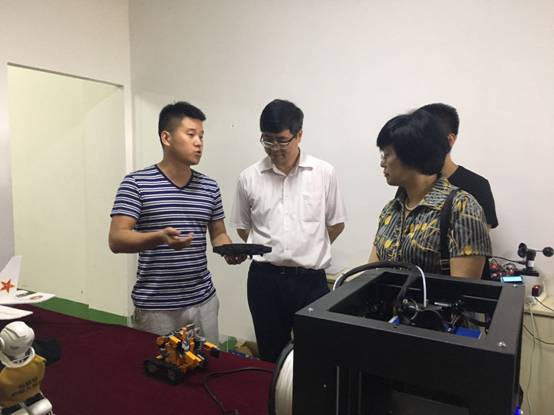 “云物大智”创客坊的负责人电子信息工程2015级学生王佳豪介绍了创客坊的建设理念,创客坊的主要业务及建设情况,并演示了学生创新项目作品。
