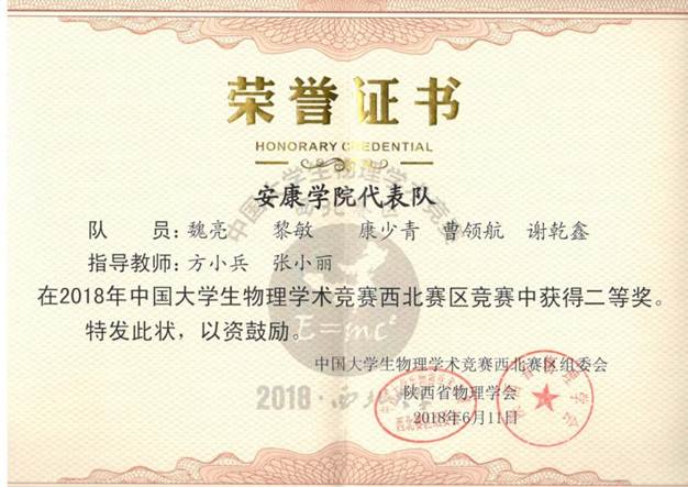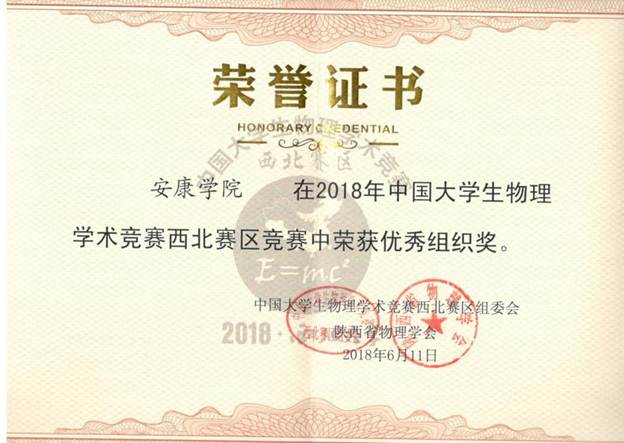 6月9日至11日,2018年中国大学生物理学术竞赛(西北赛区)在西北大学隆重举行。金年会诚信信誉至上物理系代表队获得二等奖、方小兵老师被评为优秀裁判,我校被授予优秀组织奖。