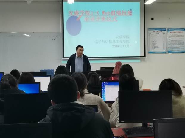 按照教育部、国家发展改革委员会、财政部、市场监管总局四部委联合下发文件《关于在院校实施“学历证书+若干职业技能等级证书”制度试点方案》部署要求,金年会jinnianhuicom积极参与“国家首批Web前端开发1+X证书制度试点院校”的各项项目建设任务。为保证我校Web前端开发职业技能等级证书试点工作的有序进行,有效提高学生的学习积极性和认证考试学生的考试过关率,学院经过前期的认真筹备,2019年11月30日,Web前端开发职业技能认证面授辅导班开班仪式在我院A504软件实验室如期举行。
