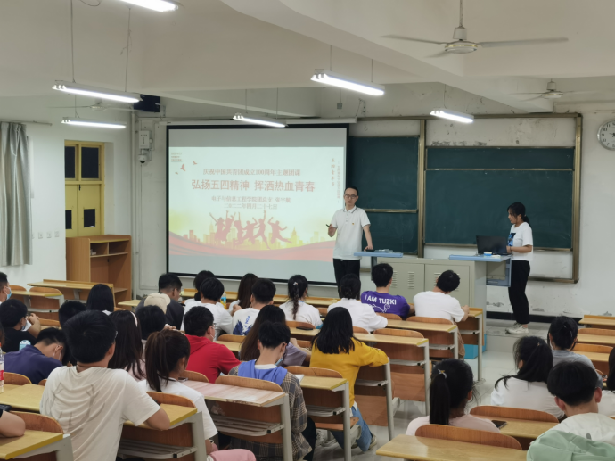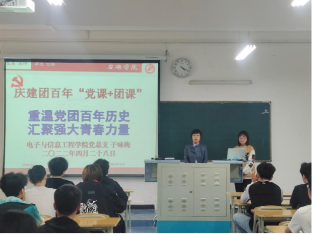 坚持党建带团建 为激发金年会jinnianhuicom广大团员青年爱党、爱国情怀,实现党建带团建的目标,培养电信学子践行社会主义核心价值观,以昂扬的斗志和精神状态庆祝建团百年,迎接党的二十大胜利召开,4月28日,金年会jinnianhuicom党总支书记于咏梅在1307教室以“重温党团历史,汇聚强大力量”为主题,为电信学子上了一堂生动的主题“党课+团课”。