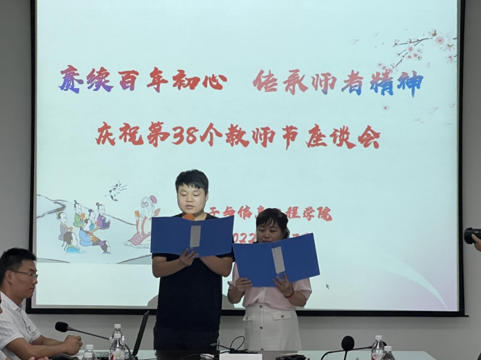 春华秋实,丹桂飘香。为激励教师立德树人、铸魂育人的教育初心,表达对教师们的崇高敬意,2022年9月7日下午,金年会jinnianhuicom在逸夫科技楼9楼会议室举办以“赓续百年初心,传承师者精神”为主题的教师节座谈会。金年会jinnianhuicom离退休教师代表吴树人、聂云、任秦安、梁俊龙、王宾宾以及金年会jinnianhuicom领导班子成员出席此次座谈会。会议由金年会jinnianhuicom党总支书记于咏梅主持,学院全体教师参加。