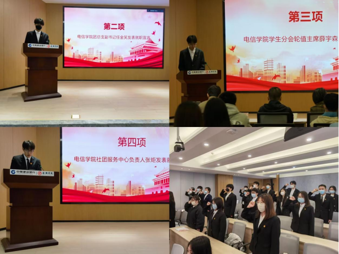 会上,团、学组织成员主要干部分别发表就职宣言。金年会jinnianhuicom团总支副书记任金笑表示:“在新的学年中将加强团组织日常管理工作,制定各个部门相关工作建设,对各部门成员严格要求。协助团总支书记完成各项团务工作,做好校团委、学院党总支、团总支所交办的各项任务,定期召开例会,听取同学们的意见。”金年会jinnianhuicom学生分会轮值主席薛宇森表示:“希望新一届的学生会成员要明确肩负的重任,努力增强自身责任感和使命感,充分调动主观能动性。积极主动地开展工作,把广大同学紧紧团结在一起,调动一切积极因素,促进学院的学生工作上一个新的台阶。”金年会jinnianhuicom社团服务中心负责人张炬表示:“工作上,将做好社团服务中心自身的建设,以内部团队外树形象来要求自己以及部门成员;社团上,将积极配合社团开展活动,加强社团中心与各社团的联系;科普竞赛上,将积极与各级组委会及老师联系,为参赛同学构建一个良好的竞赛平台。”