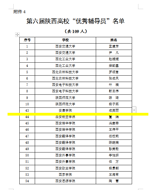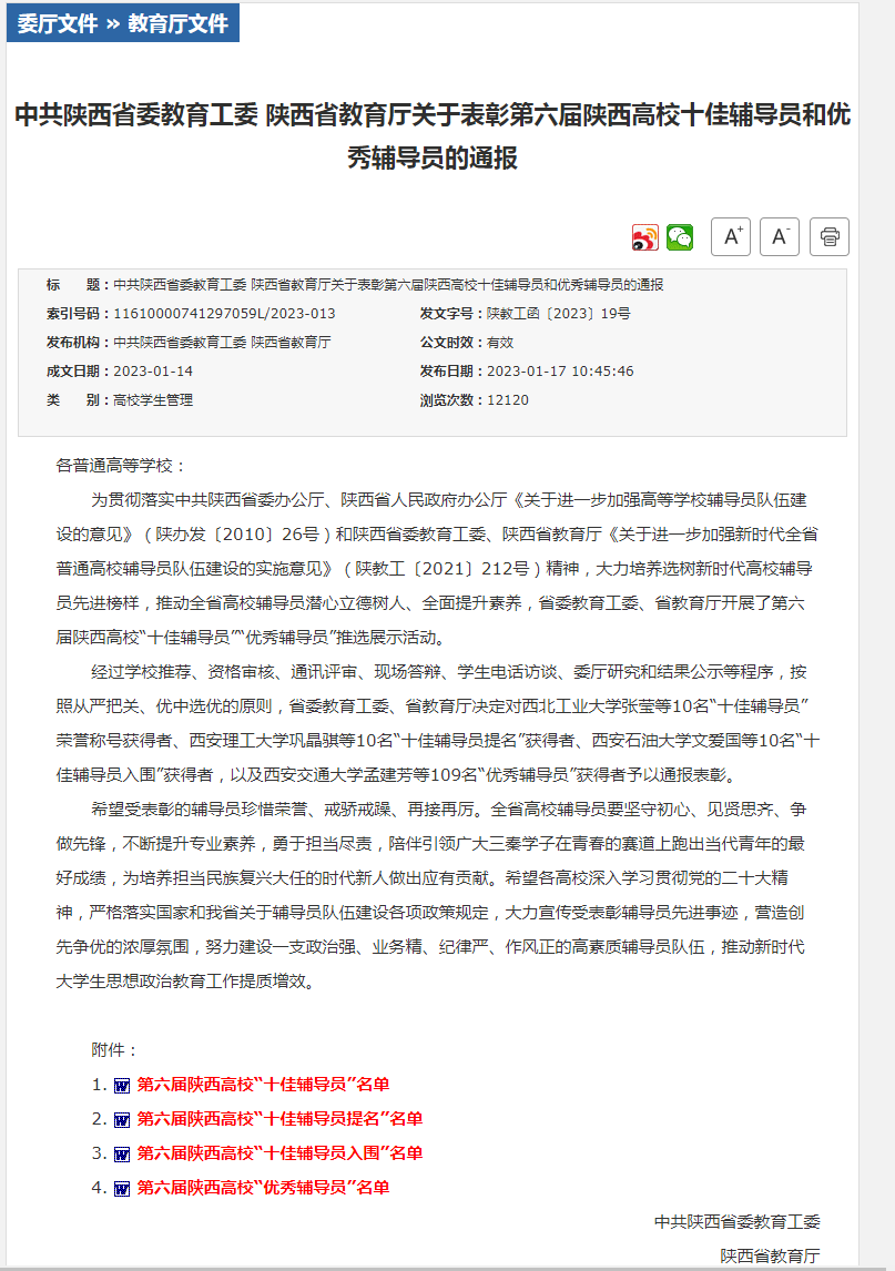 近日,中共陕西省委教育工委、陕西省教育厅发布《关于表彰第六届陕西高校十佳辅导员和优秀辅导员的通报》,金年会诚信信誉至上辅导员成英丽获评陕西高校“优秀辅导员”荣誉称号。