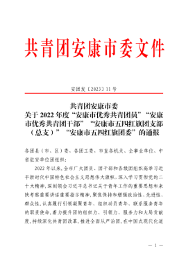 近日,共青团安康市委印发了《共青团安康市委关于2022年度“安康市优秀共青团员”“安康市优秀共青团干部”“安康市五四红旗团支部(总支)”“安康市五四红旗团委”的通报》(安团发〔2023〕11号)中,我院团总支被授予“安康市五四红旗团总支”称号。