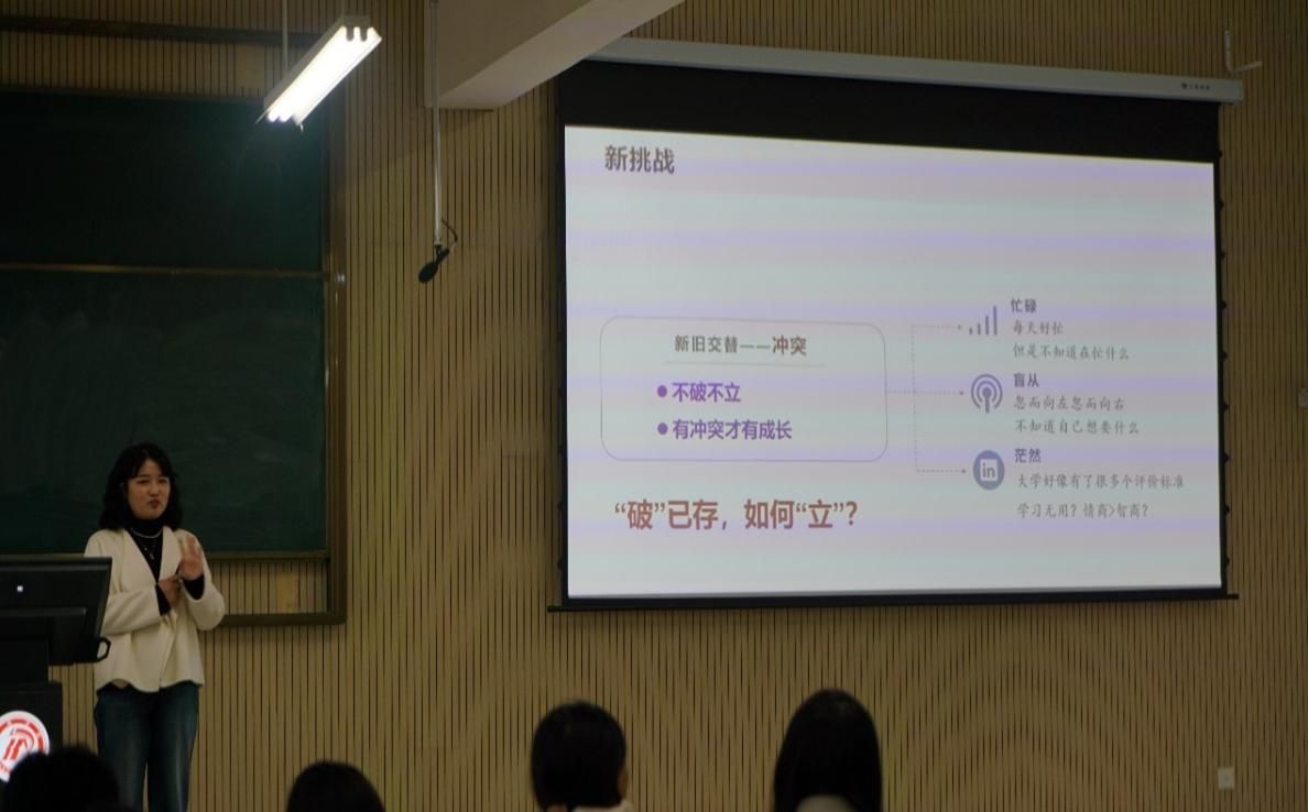 柯小敏以热门网络用语引入话题,指出当代大学生在大学生活以及学习当中存在的问题,并以提问的形式和同学积极互动。柯老师从“新阶段”、“新环境”、“新挑战”、“心接纳”、“心成长”和“心健康”等六个方面为同学们进行细致讲解,并总结了同学们进入大学后遇到的适应性问题,对学习环境、人际关系环境和生活环境的变化也进行了详细地分析。