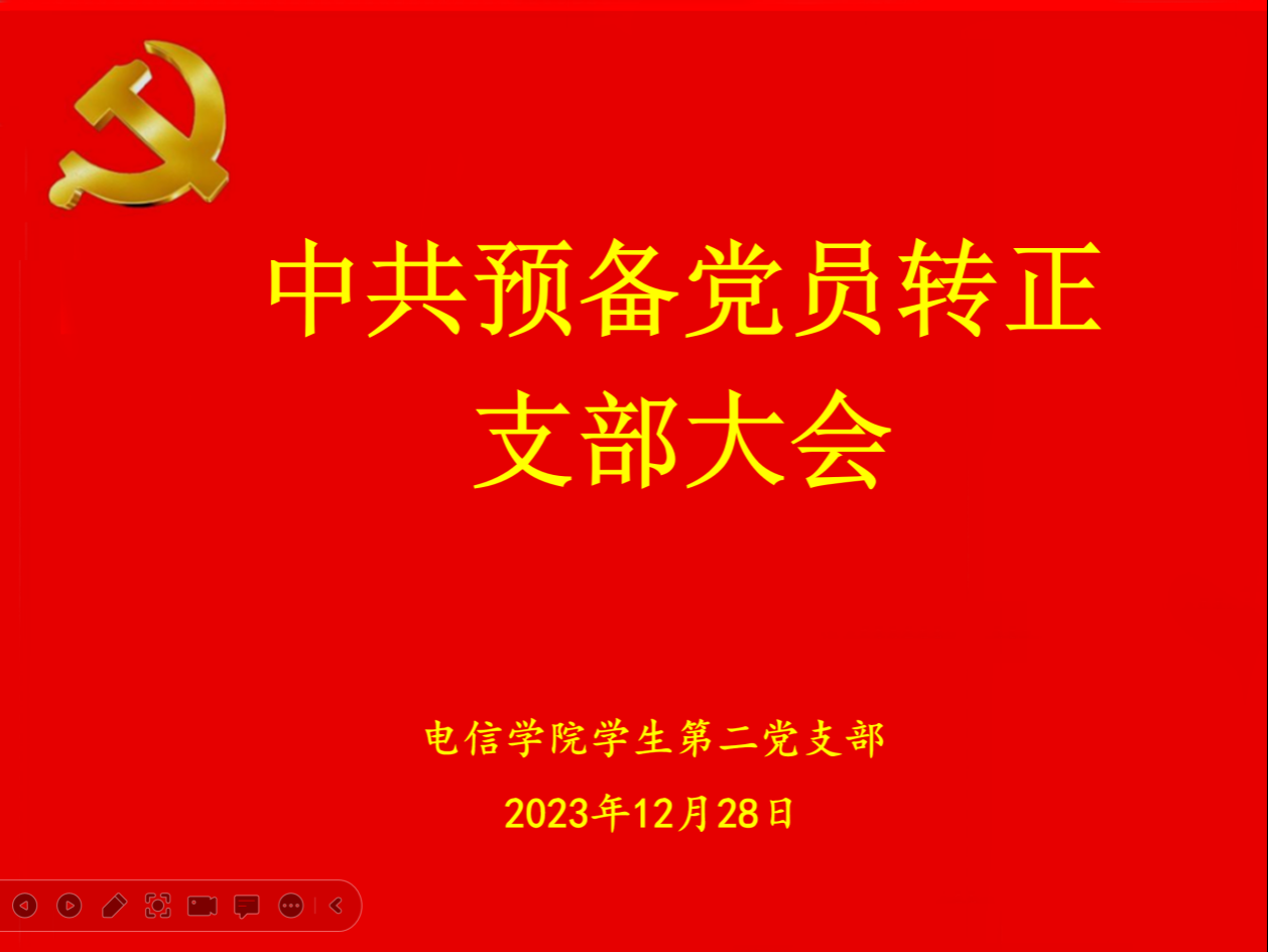 2023年12月28日晚上7点40,金年会jinnianhuicom学生第二党支部采用线上腾讯会议的形式召开了中共预备党员转正党员大会,会议主要讨论了翟子轩等六名中共预备党员的转正事宜。金年会jinnianhuicom学生第二党支部书记李章雨、组织(纪检)委员石纭昊,以及支部全体党员参加了本次会议。会议由李章雨主持。