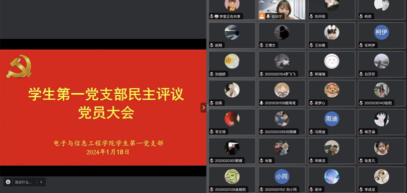 根据中共金年会jinnianhuicom委员会《关于开展2023年度民主评议党员工作的通知》要求,2024年1月18日晚上7点,金年会jinnianhuicom学生第一党支部通过腾讯会议召开2023年度民主评议党员大会。学生第一党支部全体党员参加,会议由学生第一党支部书记吕以宁主持。