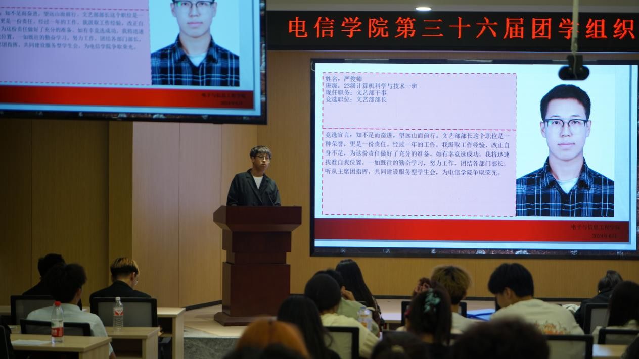 参与团总支、学生会、社团服务中心干部竞选的同学根据换届选举竞选要求,依次上台进行5分钟竞选演讲。竞选环节中,各候选人分别对自己已开展的工作进行了总结,谈到了自己在工作、组织中的收获、荣誉与成长,并阐述了自己未来工作的规划设想和展望。同时也表示在以后的工作中定会不忘初心,奋发向上,积极改革创新,为学院团学组织的发展贡献自己的一份力量。