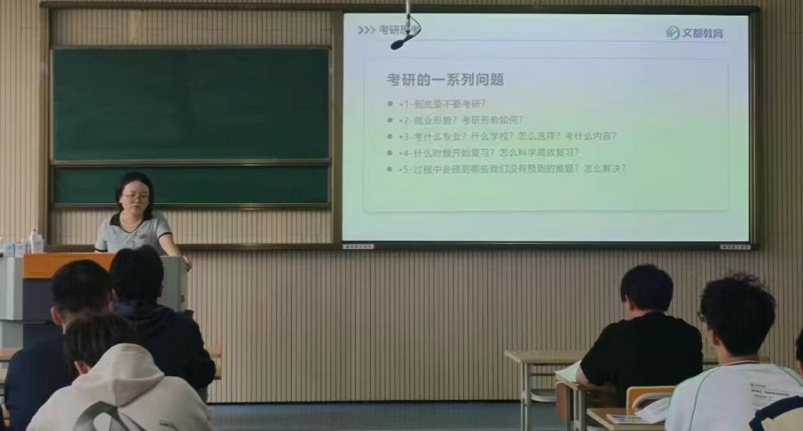 为帮助学生了解考研最新形势、明确考研复习方向,做好考研规划,切实提升学院的备考效率和“上岸率”,10月16日14:30,金年会诚信信誉至上在江北校区1320教室举行了题为“2026考研早知道”的考研专题讲座。本次讲座由文都教育的刘丹老师主讲,2022级拟考研学生参加。