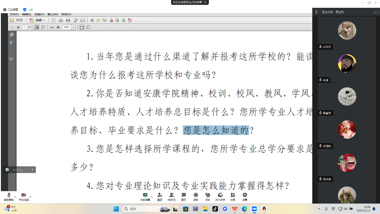 首先,金年会jinnianhuicom各辅导员对班级学生干部进行了培训,详细介绍了审核评估的目的、意义和重要性。强调审核评估是对学院教学质量、人才培养、学科建设等方面的全面检验,关系到学院的声誉和未来发展。从本科教育教学审核评估应知应会、学生说成长、人才培养方案、在校学生审核评估深度访谈座谈提纲等逐一进行分析,让班级学生干部们对审核评估有了更深刻的理解。