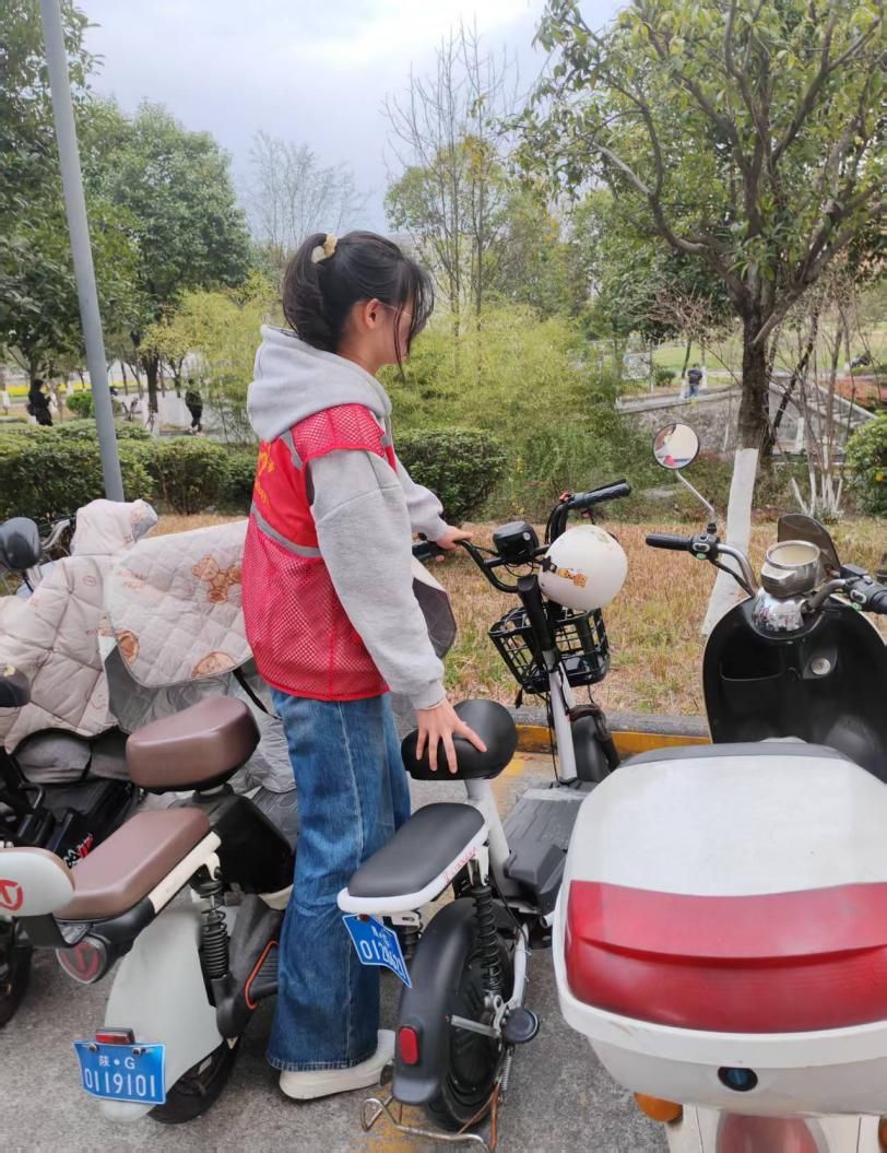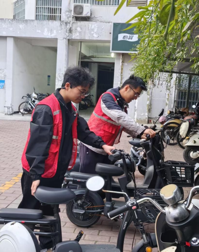 活动期间,志愿者们身着标志性的红马甲,活跃在校园的各个停车区域。他们针对电动车、摩托车、自行车存在的乱停乱放,以及占用人行道等公共区域的现象,积极展开劝导和整理工作。志愿者们将不规范停放的自行车和电动车统一挪至非机动车停车点位,并按照泊位内箭头方向统一调整车头朝向,使非机动车停放整齐有序。